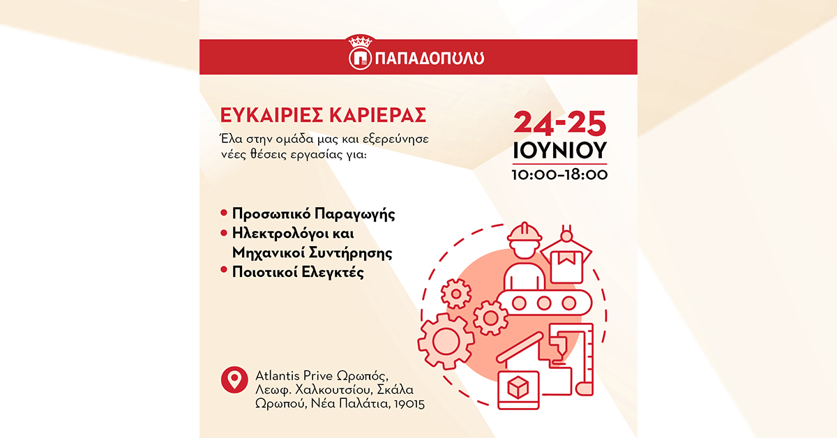 Ενδεικτικά οι διαθέσιμες θέσεις εργασίας του Εργοστασίου της Εταιρείας Παπαδοπούλου στα Οινόφυτα: